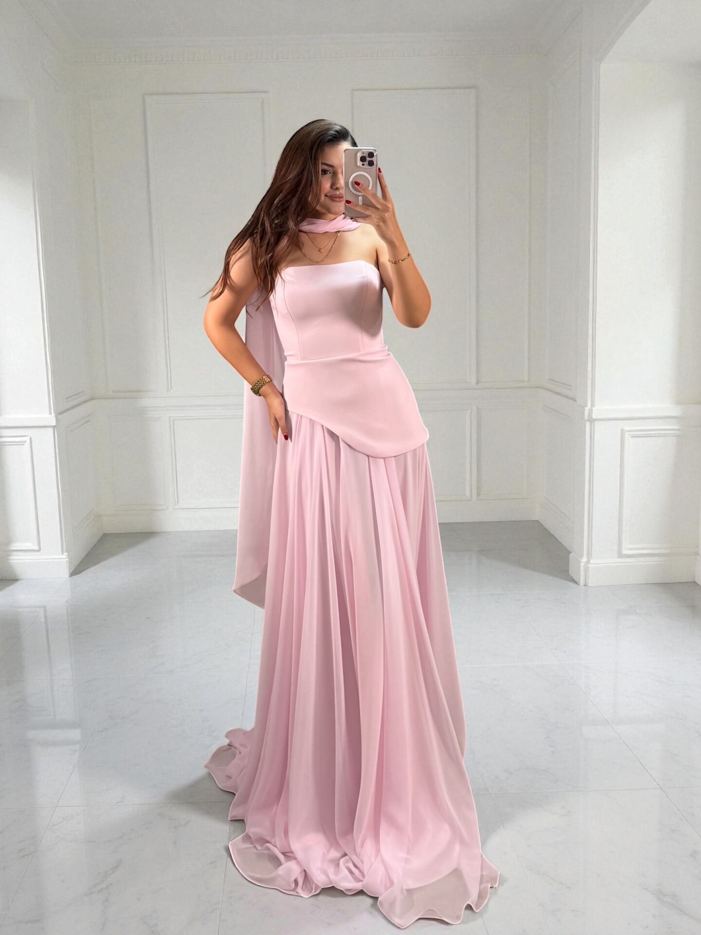 Oriva Korseli Şifon Fular Detaylı Pudra Pembe Abiye Elbise 36