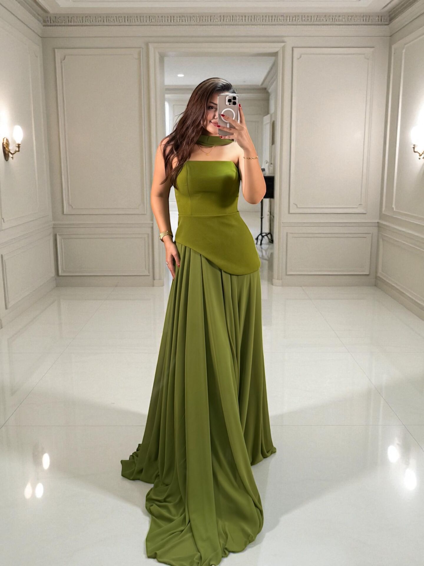 Oriva Korseli Şifon Fular Detaylı Yeşil Abiye Elbise 36