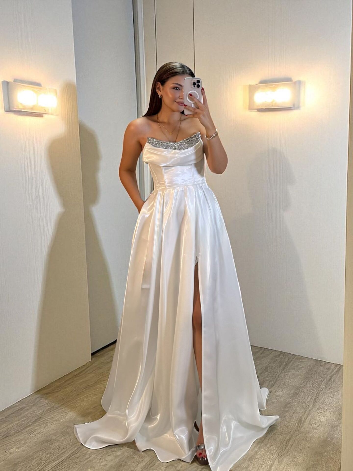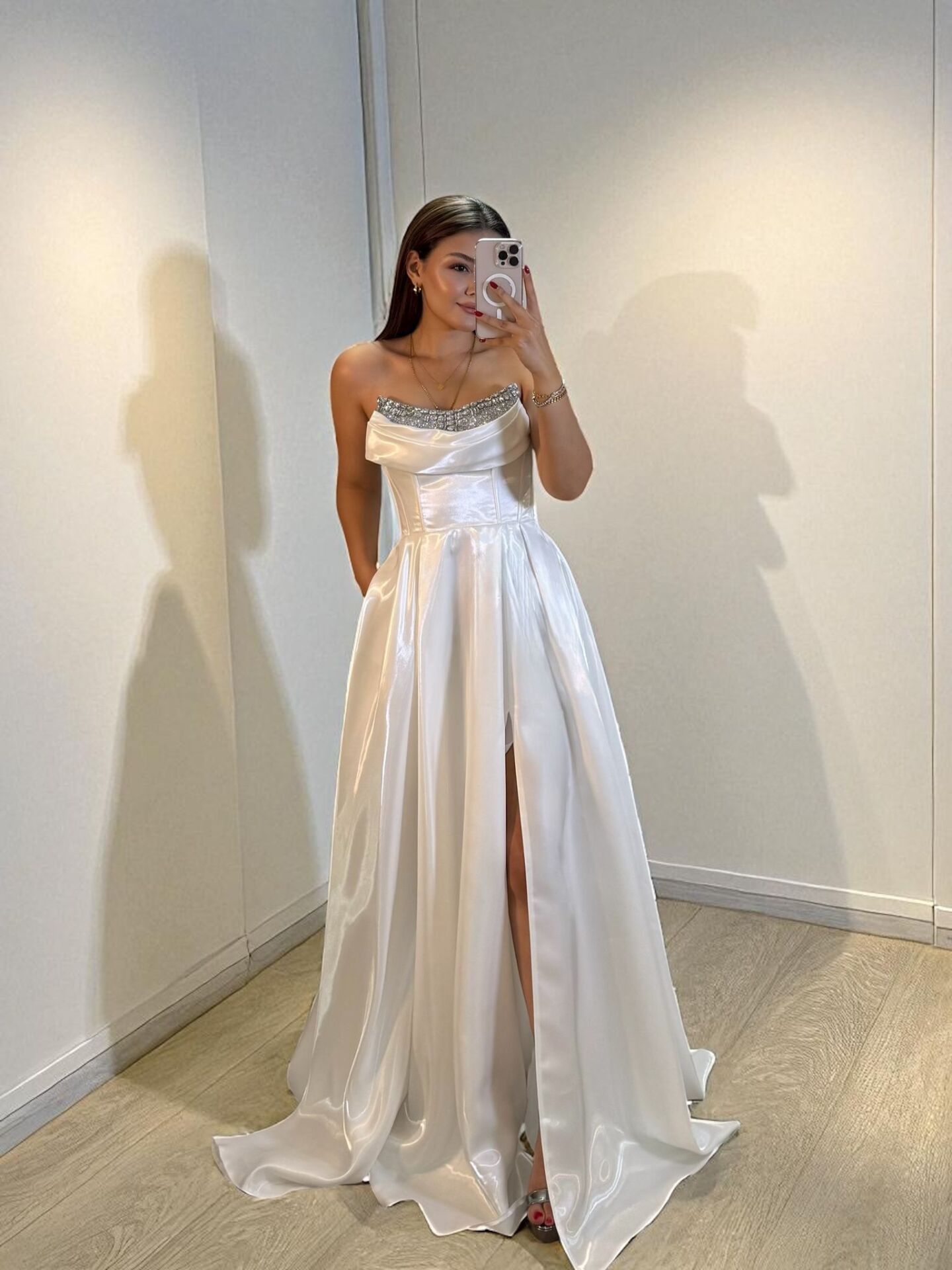 Rozel Göğsü Taşlı Parlak Saten Cepli Beyaz Abiye Elbise 38