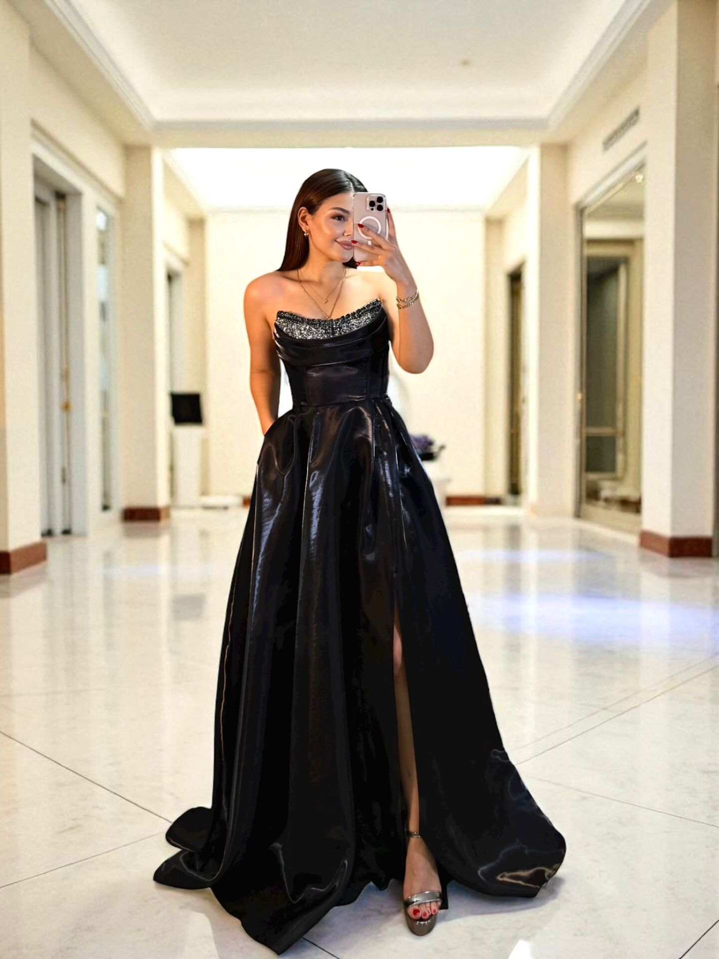 Rozel Göğsü Taşlı Parlak Saten Cepli Siyah Abiye Elbise 36