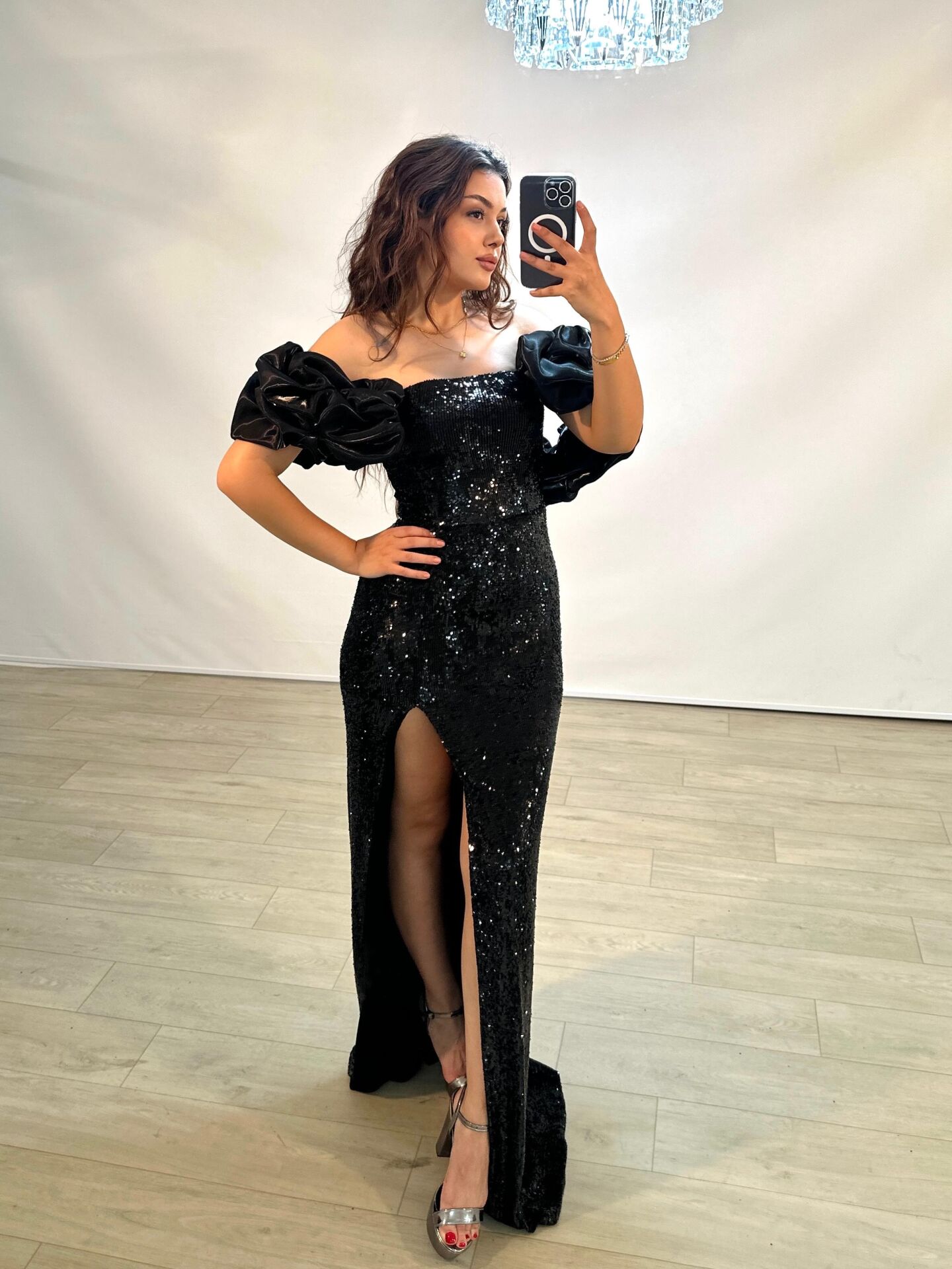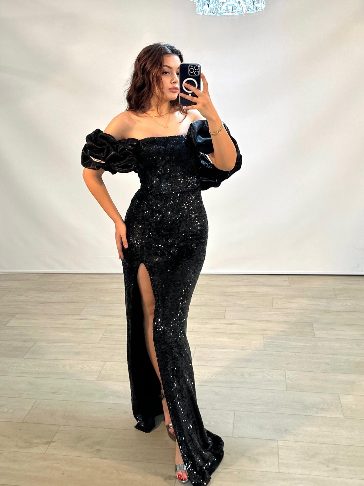 Azur Saten Kollu Full Payetli Yırtmaçlı Siyah Renkli Abiye Elbise 36