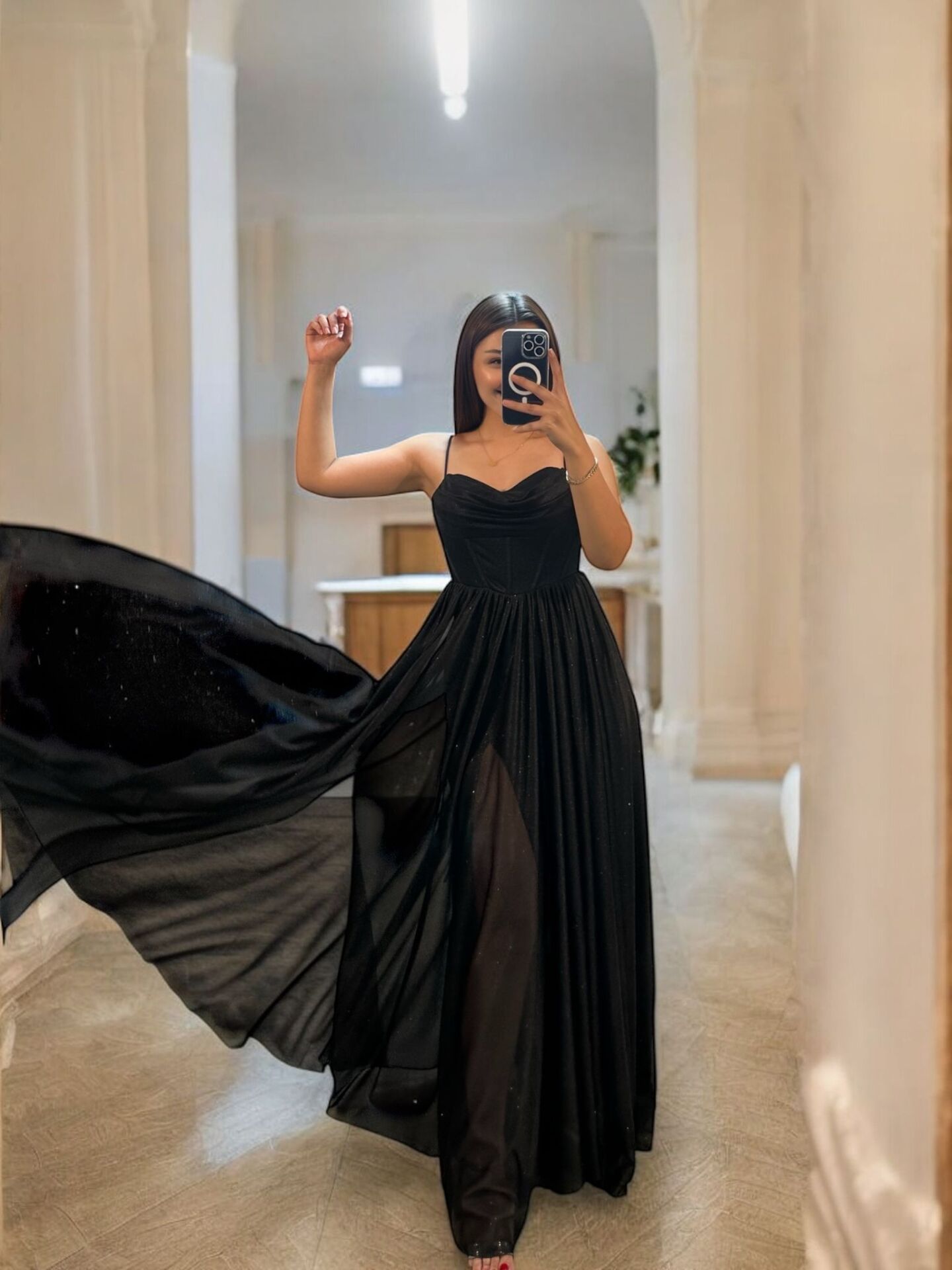 Kendinden simli uçuş uçuş tül kumaştan abiye elbisemiz . Belden korseli yırtmaçlı modeldir. Arka biriti ( ipleri ) göğüs ve bel ölçünüze göre rahatlıkla ayarlanabilir. Yırtmacı istediğiniz gibi kapattırıp açtırabilirsiniz .Modelde 38 beden kullanılmıştır.