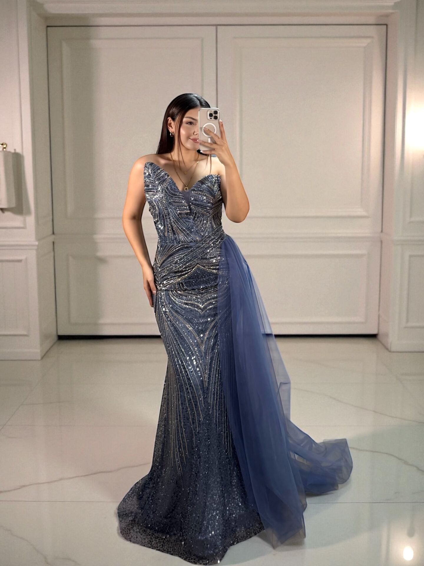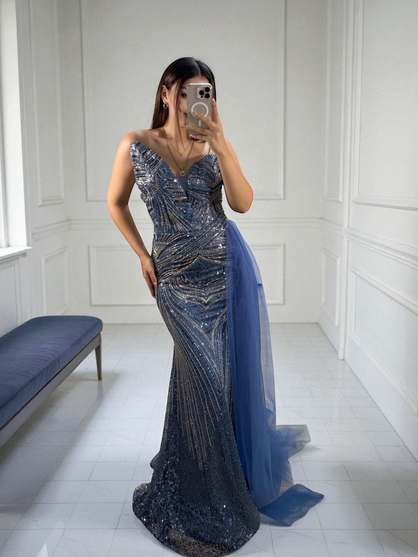 Sortie Tasarım Boncuk Ve Payet İşlemeli İndigo Balık Elbise