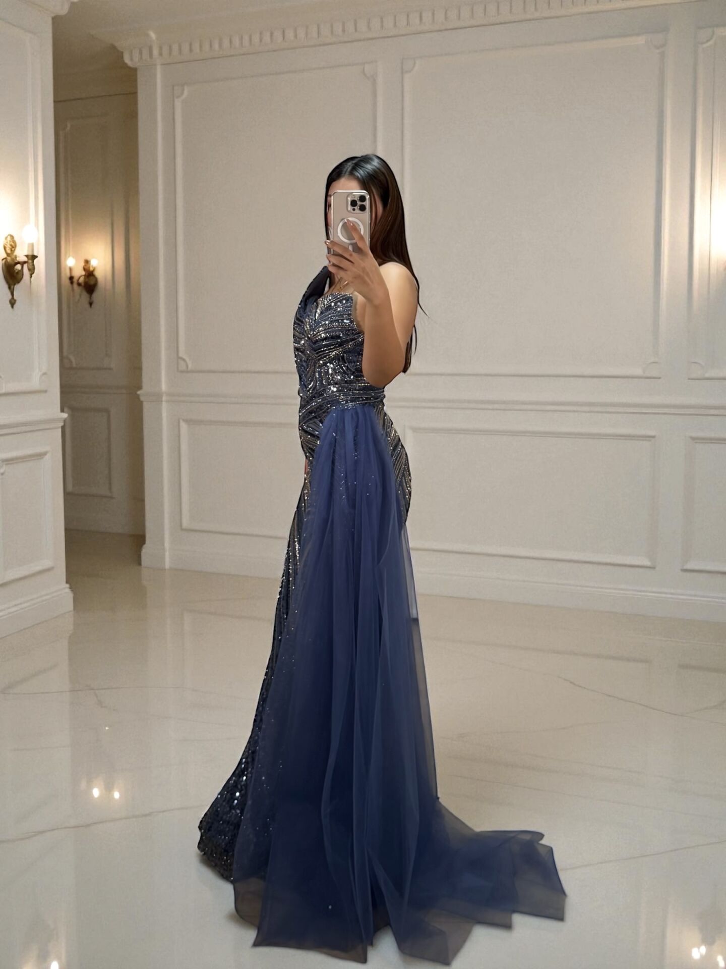 Sortie Tasarım Boncuk Ve Payet İşlemeli İndigo Balık Elbise 38