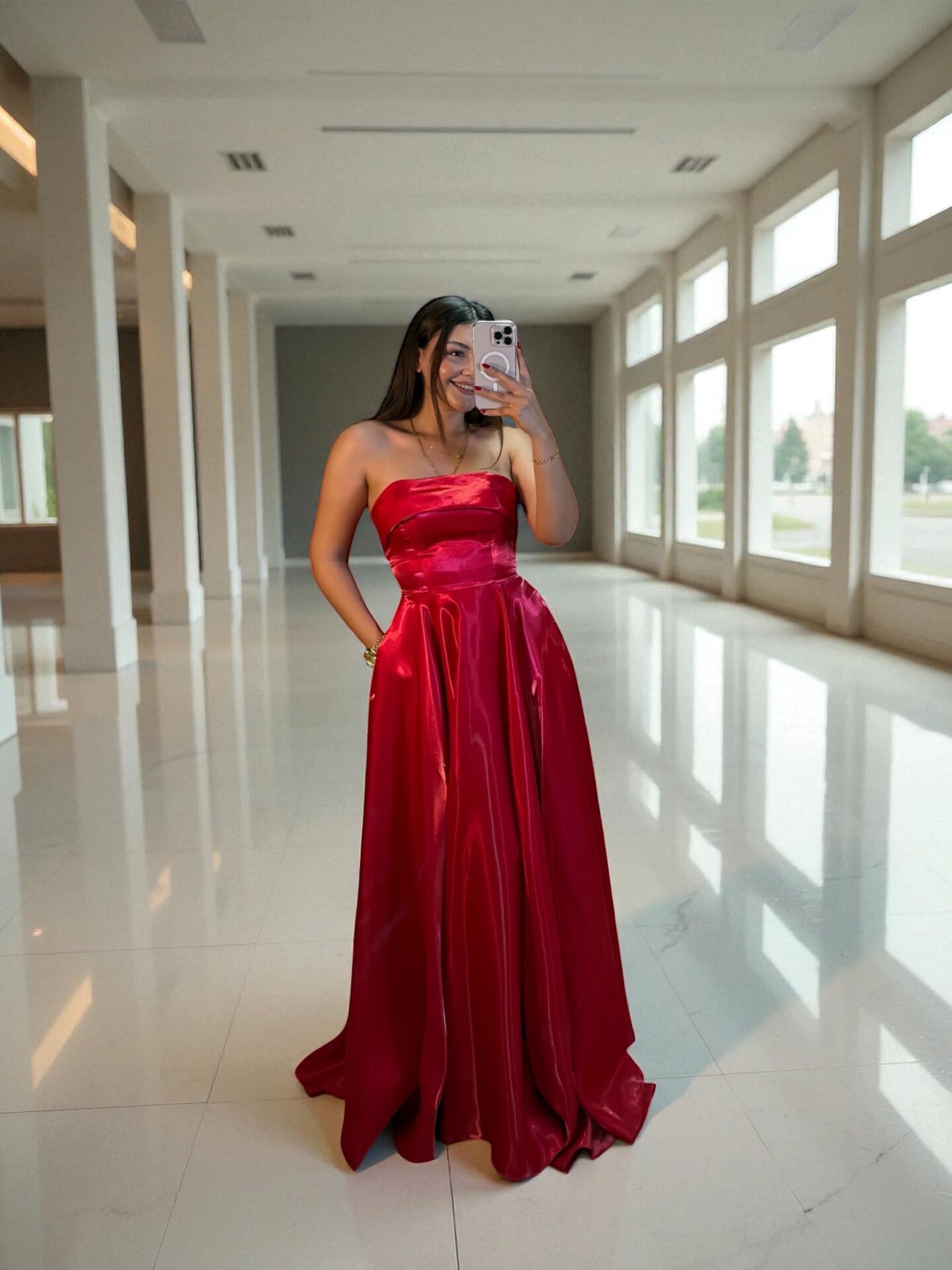 Stella Hologram Saten Straplez Kırmızı Renk Abiye Elbise 38