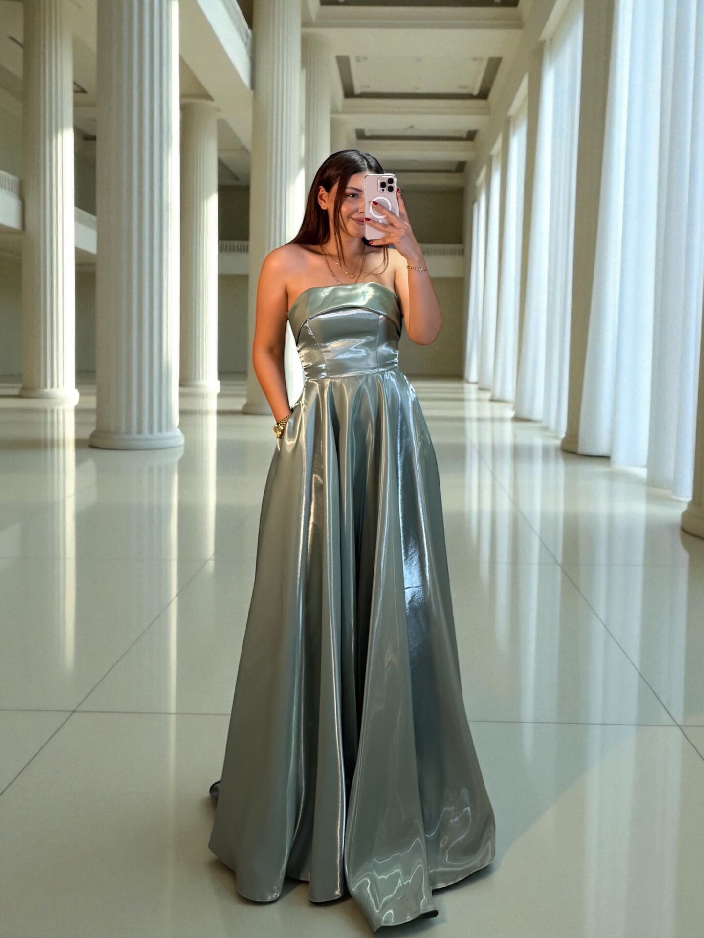 Stella Hologram Saten Straplez Mint Yeşili Renk Abiye Elbise