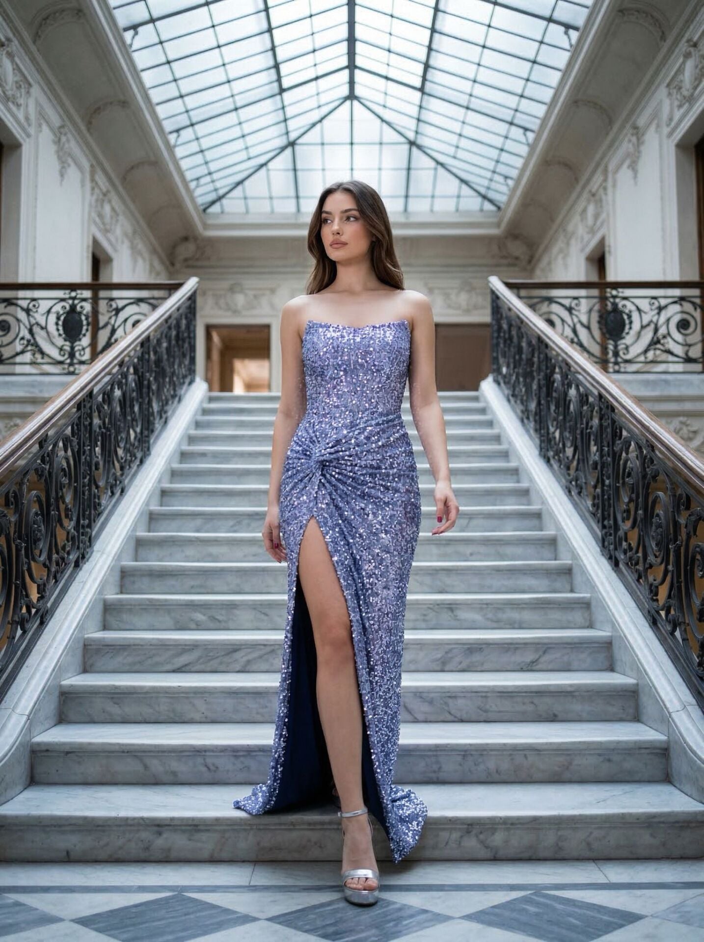 Glam Straplez Full Payetli İndigo Renk Balık Model Abiye Elbise 42