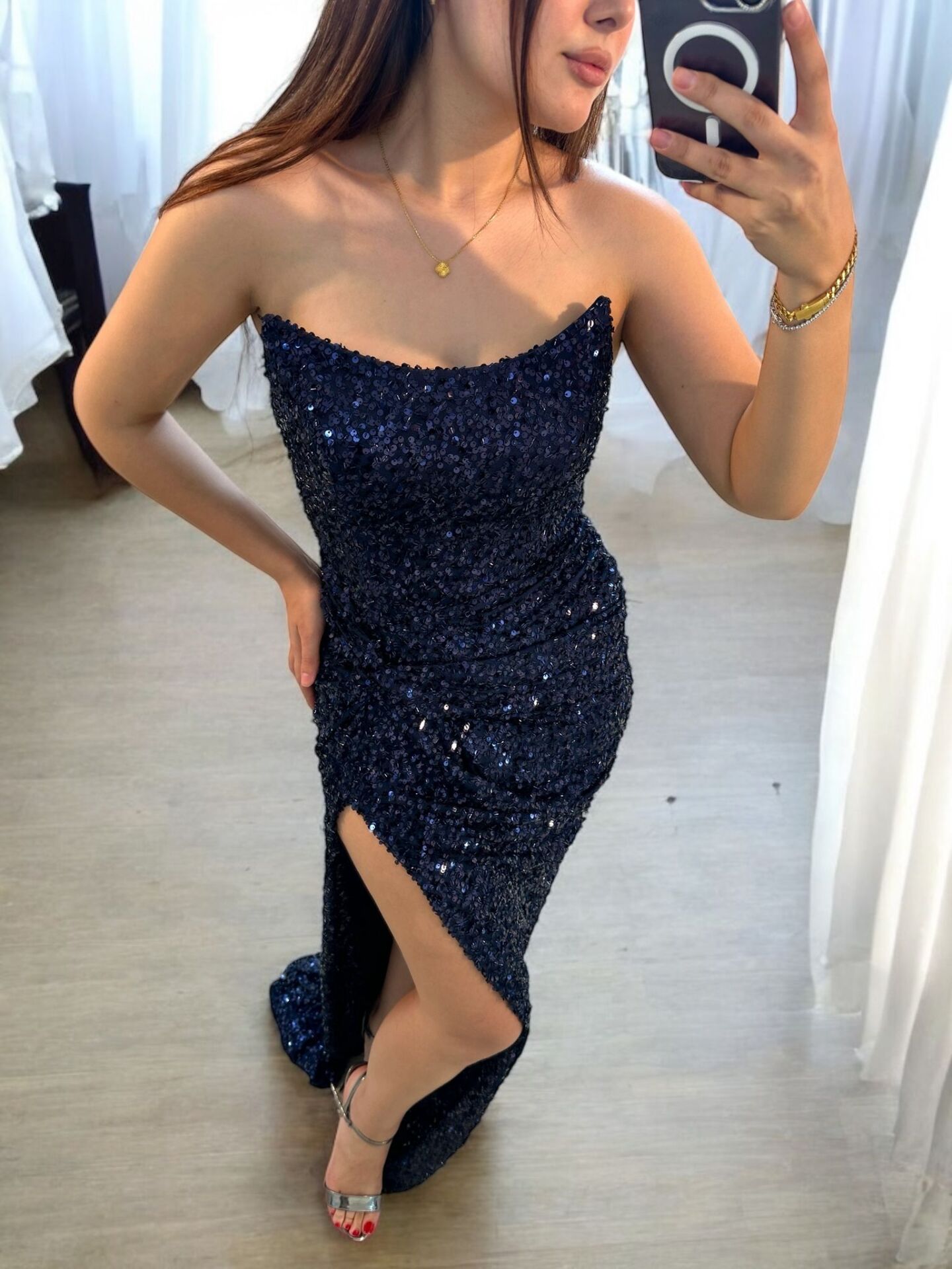 Glam Straplez Full Payetli Lacivert Renk Balık Model Abiye Elbise 38