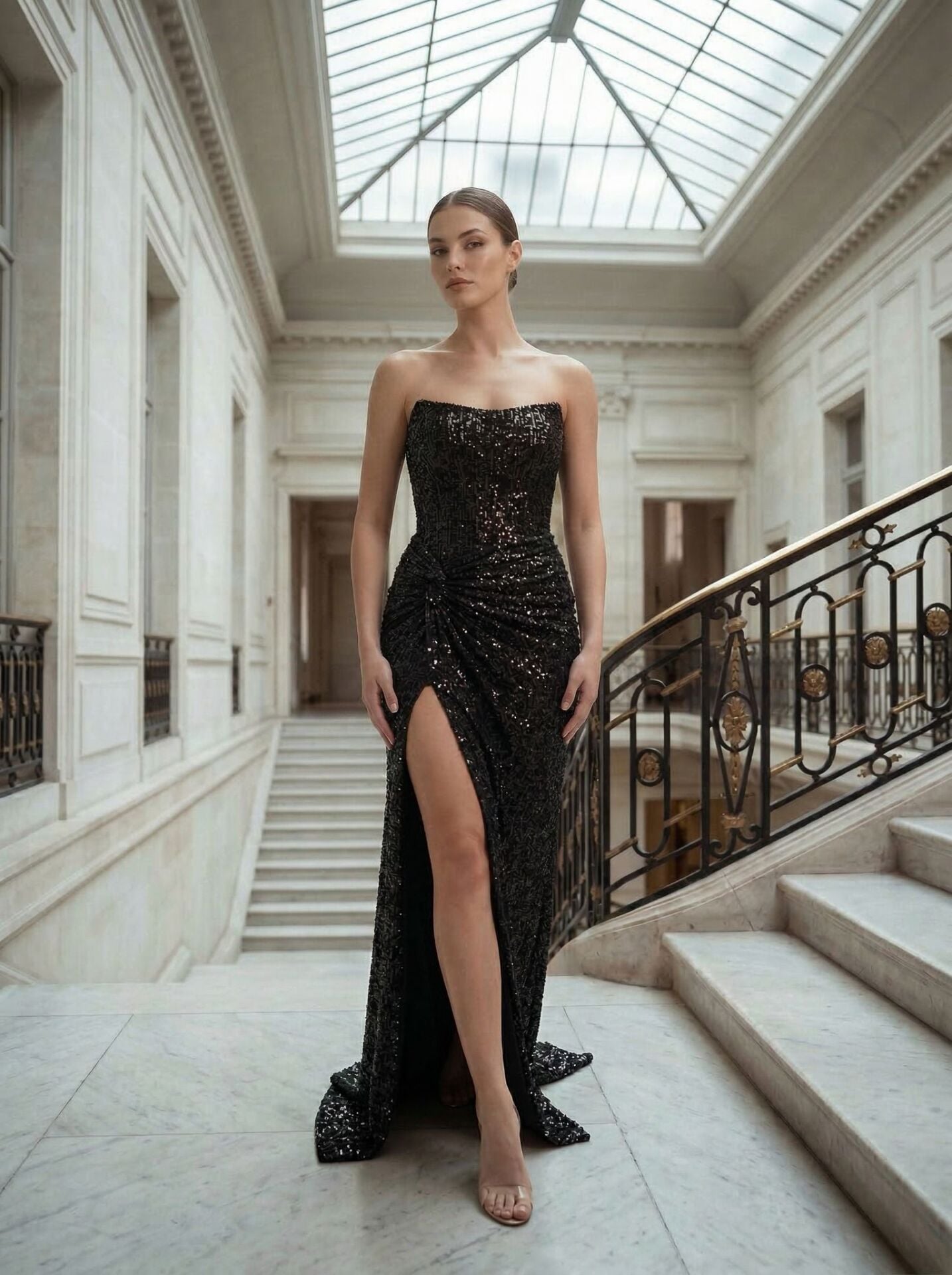 Glam Straplez Full Payetli Siyah Renk Balık Model Abiye Elbise 36