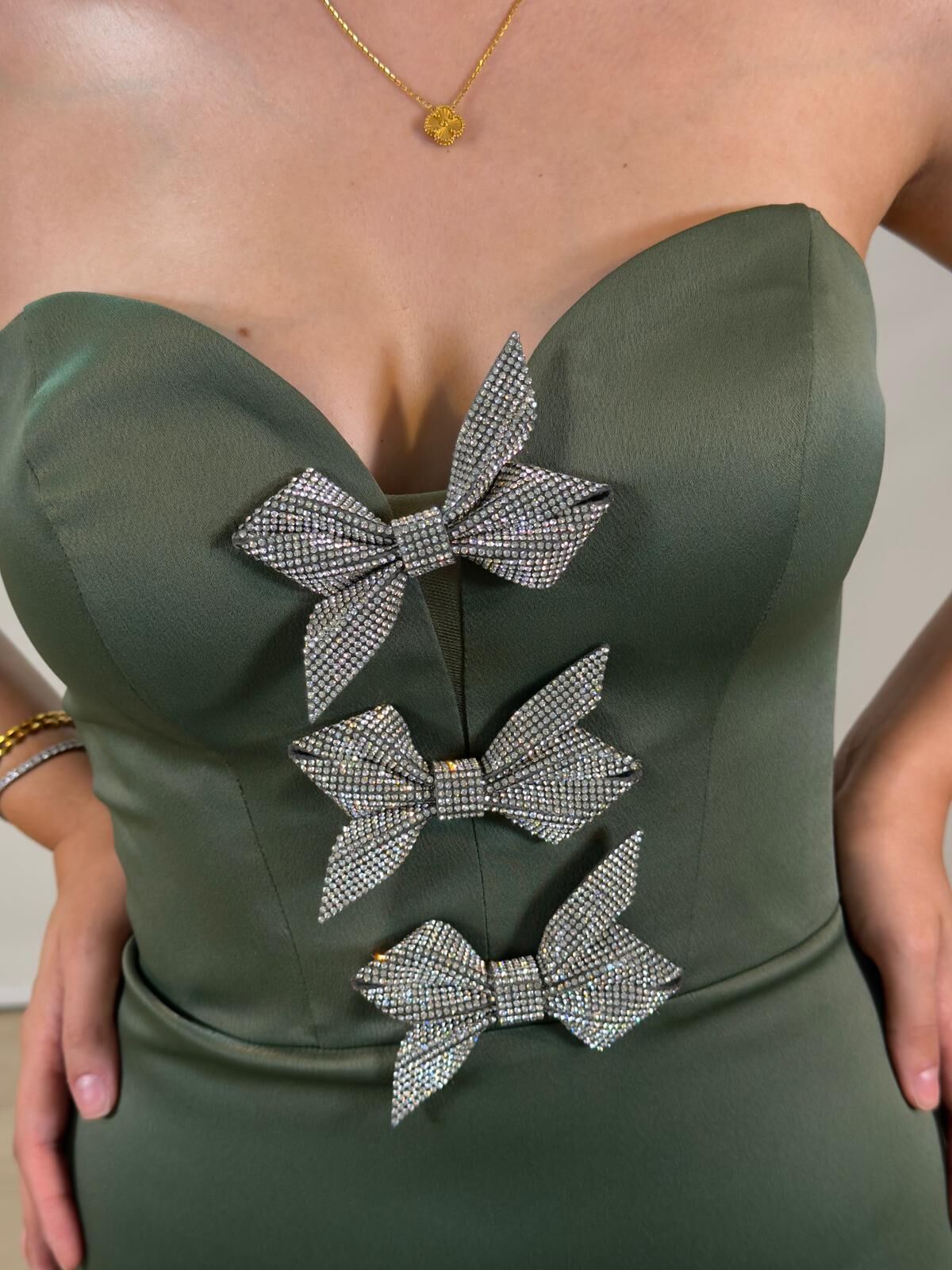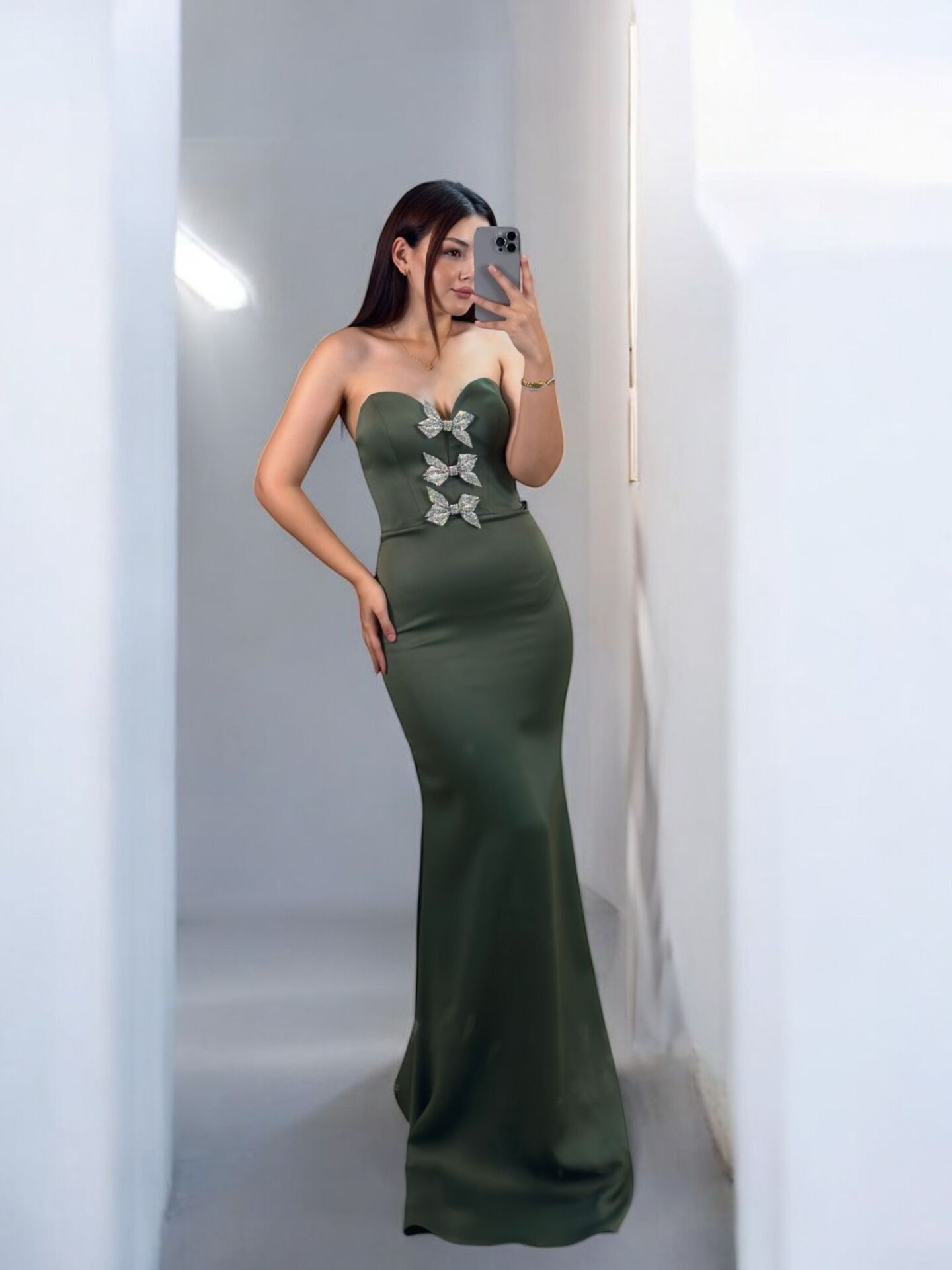 Ribon Straplez Taşlı Kurdele Detaylı Balık Model Yeşil Abiye Elbise 36