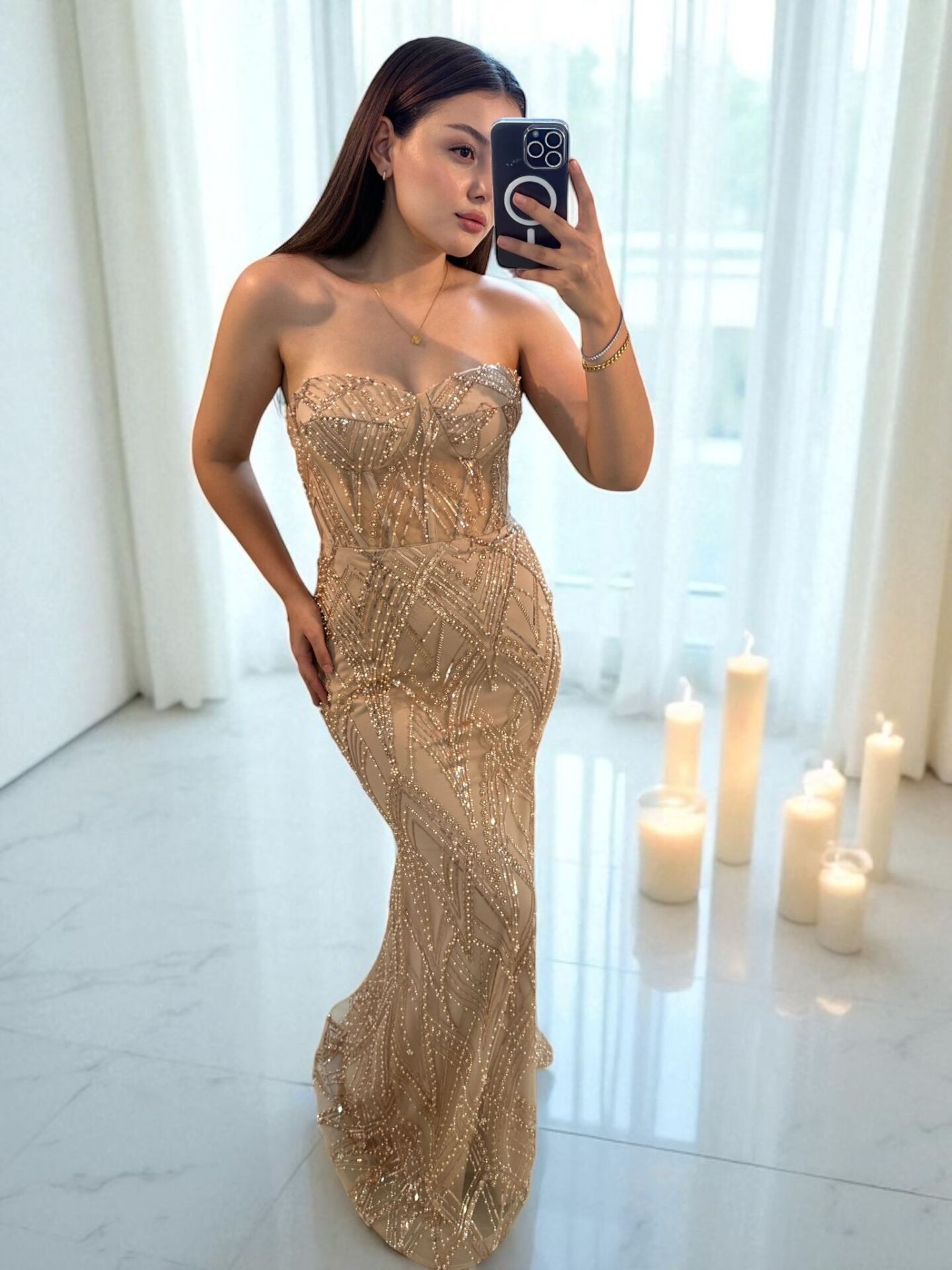 Calis Straplez Transparan Korse Detaylı Gold Renk Balık Model Elbise 36