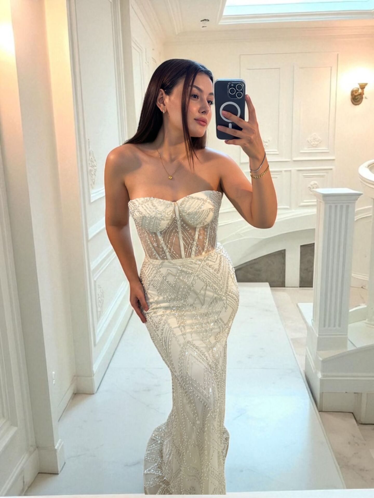 Calis Straplez Transparan Korse Detaylı Ekru Renk Balık Model Elbise 36