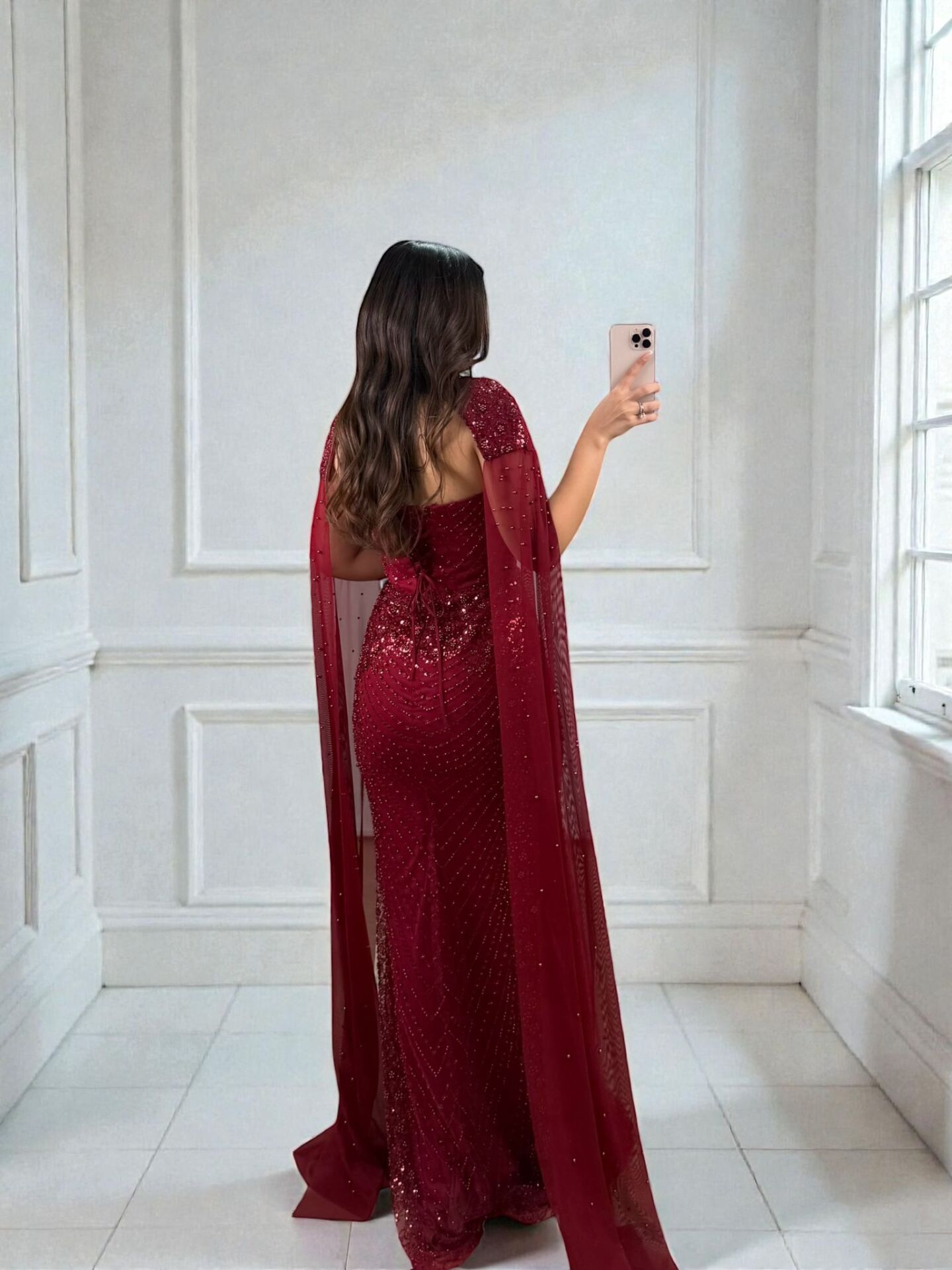 Valentina Boncuk Payet İşlemeli Pelerinli Bordo Tasarım Abiye Elbise 40