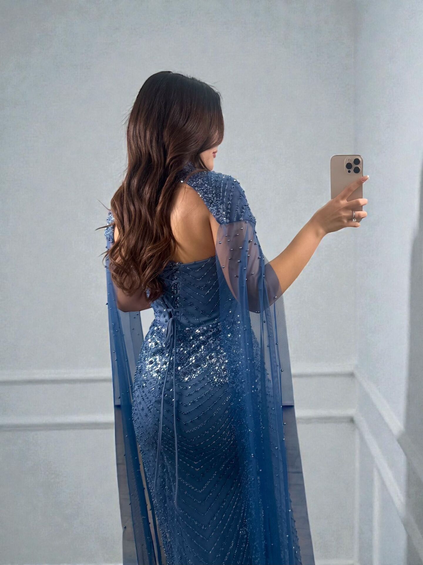 Valentina Boncuk Payet İşlemeli Pelerinli İndigo Tasarım Abiye Elbise 38