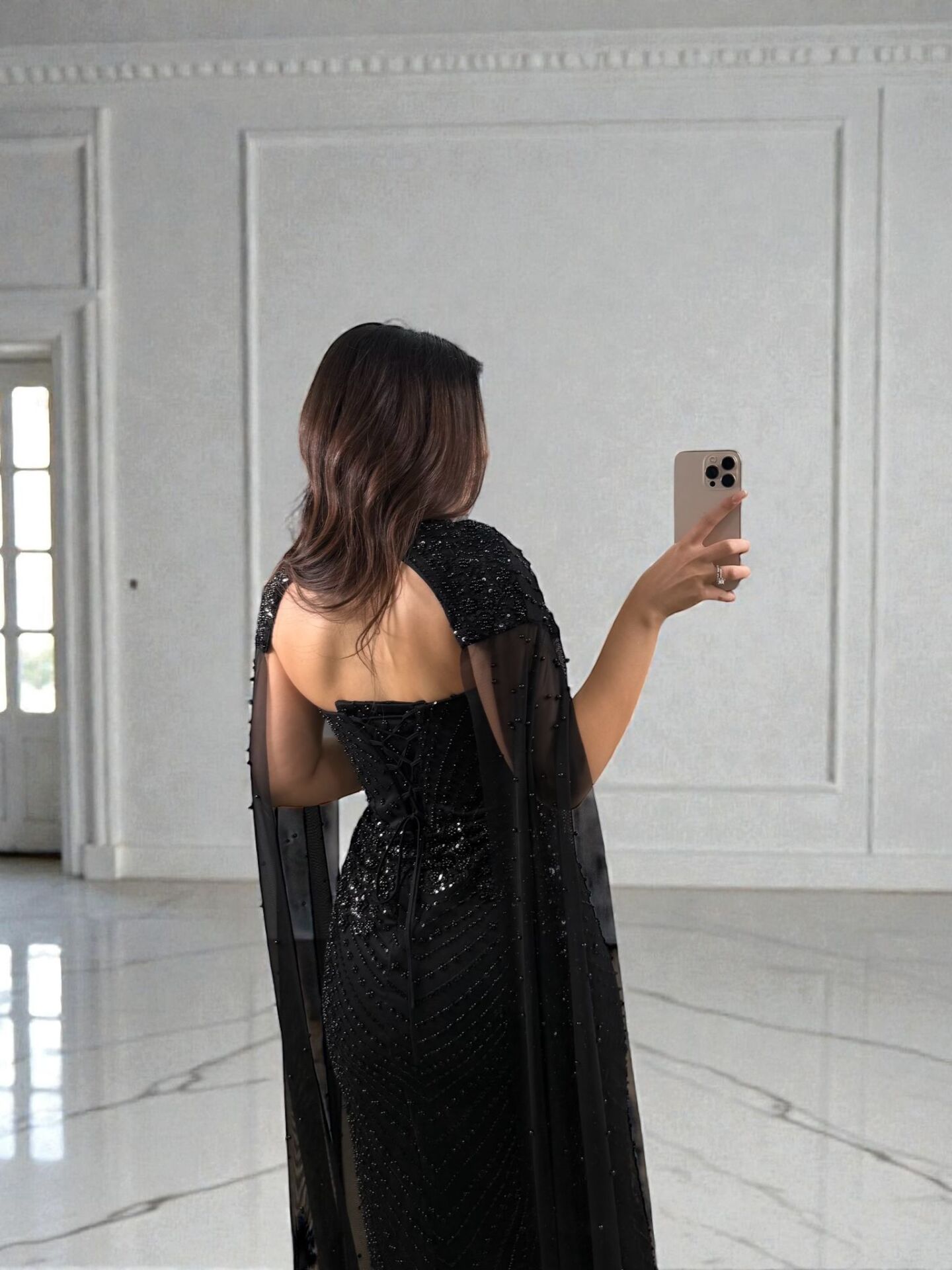 Valentina Boncuk Payet İşlemeli Pelerinli Siyah Tasarım Abiye Elbise 42
