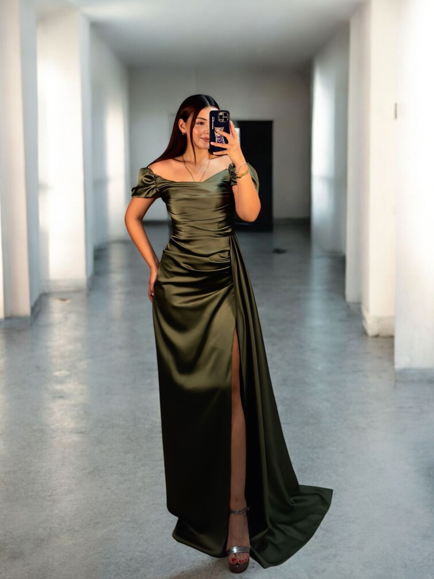 Venis Balon Düşük Kollu Gizli Yırtmaçlı Saten Haki Abiye Elbise 36