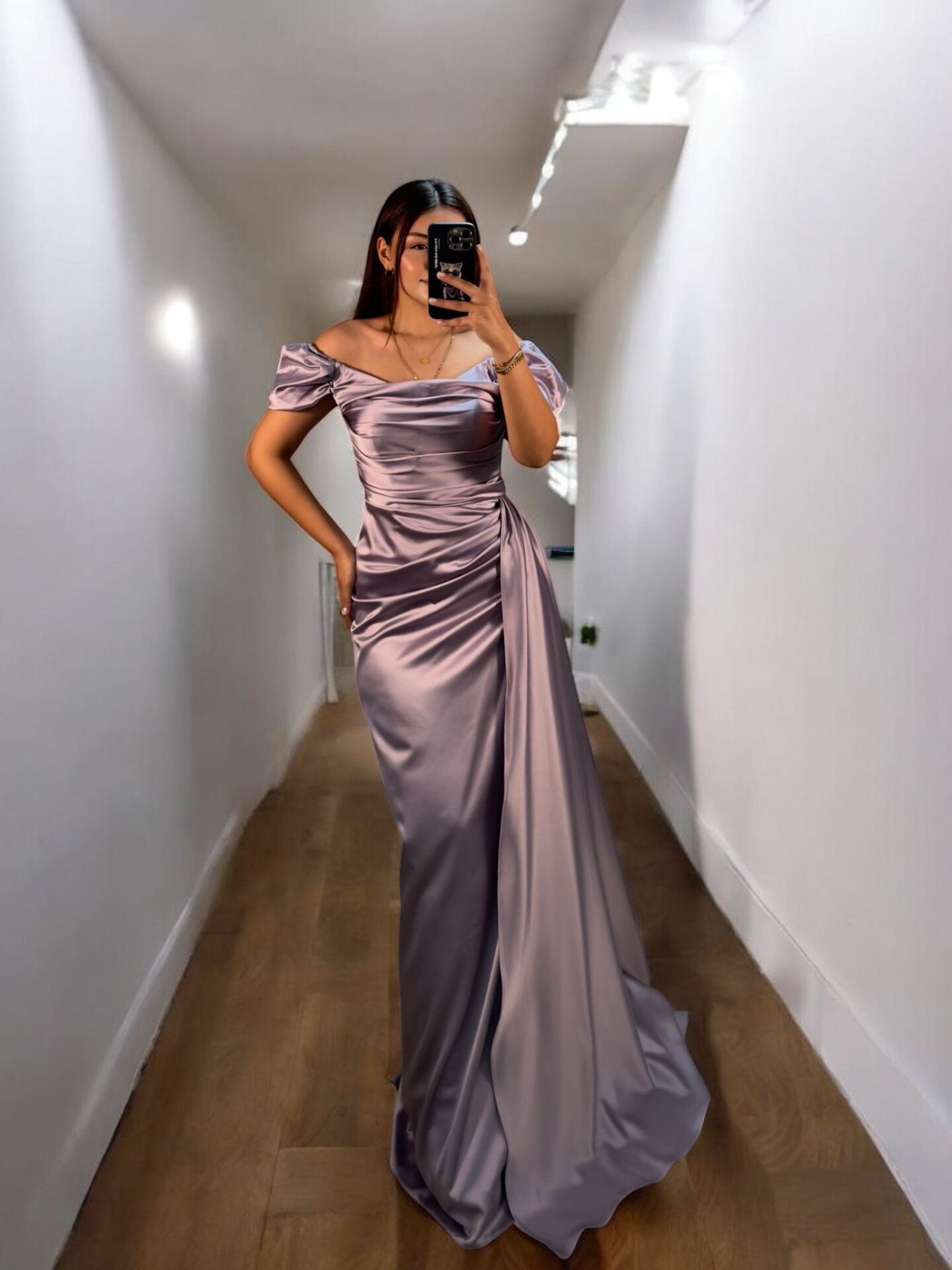 Venis Balon Düşük Kollu Gizli Yırtmaçlı Saten Lila Abiye Elbise