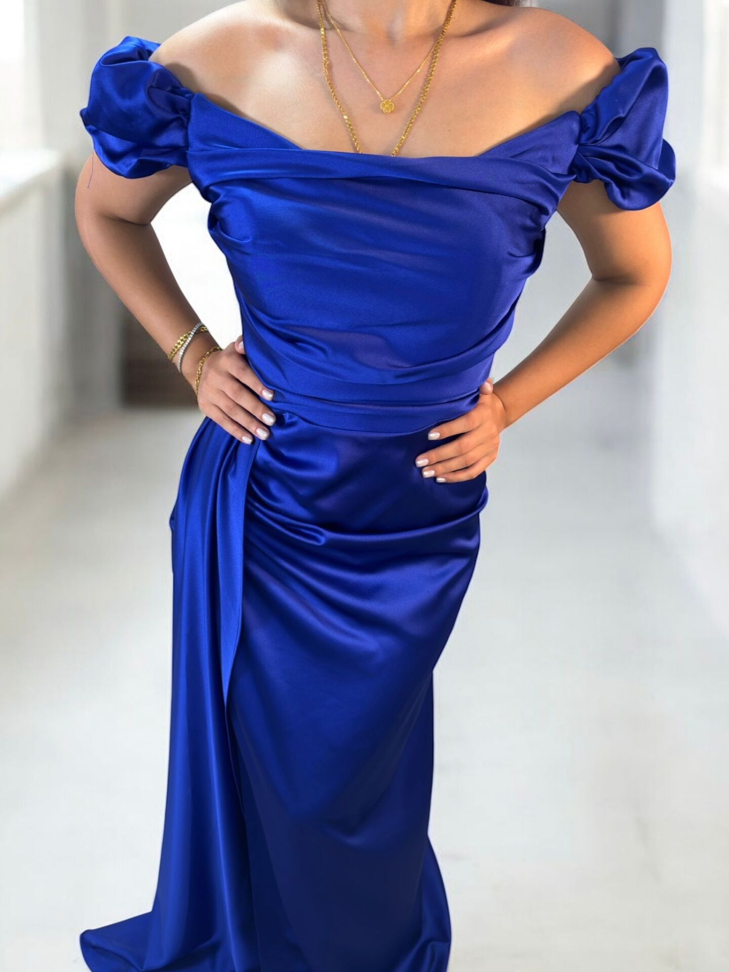 Venis Balon Düşük Kollu Gizli Yırtmaçlı Saten Saks Abiye Elbise 36